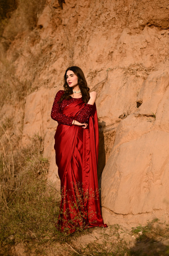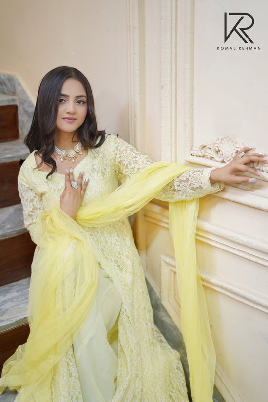 The Simran Set is a celebration of grace, femininity, and effortless charm. Designed in a soft ivory-white palette, this outfit features delicate floral lace embroidery that flows beautifully across the silhouette, creating a dreamy and refined look. The fitted bodice...